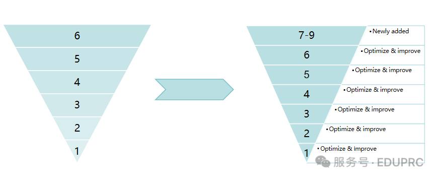 Предыдущая система из шести уровней была усовершенствована путем введения новой трехуровневой структуры с девятью ступенями, включающей уровни HSK 7-9. Таким образом создана целостная система оценки навыков владения китайским языком, охватывающая начальный, средний и продвинутый этапы освоения языка.
